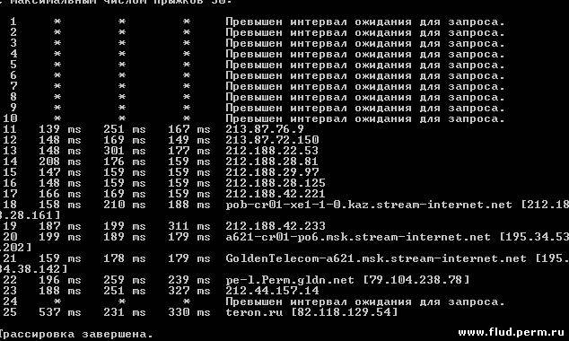 Code C:\Documents and Settings\GDV>tracert teron.ru Трассировка маршрута к teron.ru [82.118.129.54] с максимальным числом прыжков 30: 1 <1 мс <1 мс <1 мс 192.168.1.1 2 6 ms 1 ms 1 ms 188.43.4.165 3 43 ms 2 ms 201 ms 188.43.4.166 4 3 ms 3 ms 3 ms Lukoil-gw.transtelecom.net [217.150.46.197] 5 * * * Превышен интервал ожидания для запроса. 6 5 ms 3 ms 4 ms teron.ru [82.118.129.54] Трассировка завершена. C:\Documents and Settings\GDV> |