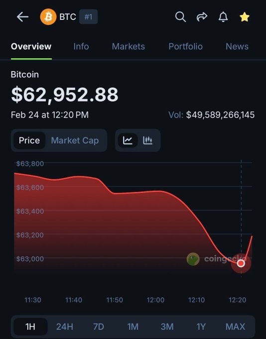13:31:25 Цена биткоина опустилась ниже $63 тысяч долларов | |